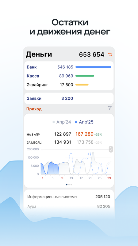 • — В раздел «Деньги» добавили информацию о долгах. — Появилась возможность создавать кассовые ордера и заявки на оплату. — В разделе «Банк» теперь есть отдельные вкладки для выписок и счетов, а в «Кассе» появились страницы кассовой книги и касс.
