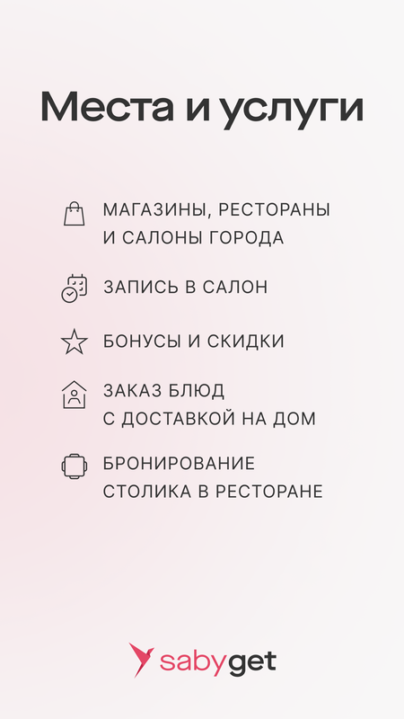 Saby Get — это единое окно для общения с ресторанами, салонами и магазинами. Одно приложение для всех.