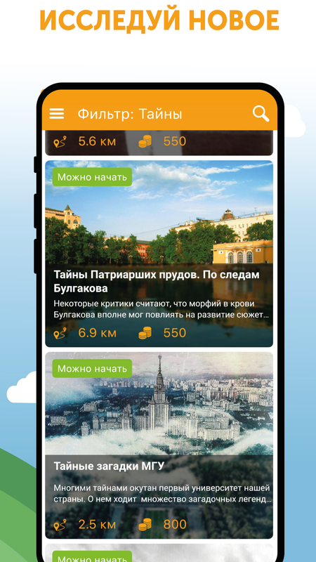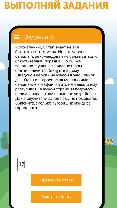 - Хотите узнать интересную информацию о городе или о любимом персонаже? Проверьте есть ли квест на интересующую вас тему в приложении.