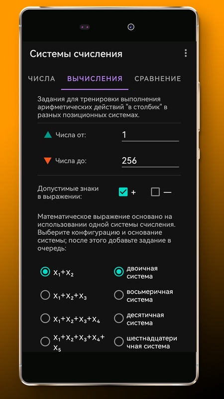 В приложении есть возможность задать свой алфавит системы счисления (16 символов). Приложение генерирует задачи для перевода или вычисления, формирует их в виде готового материала: вам остаётся только скопировать, вставить и раздать учащимся.
