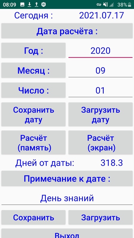расчёт дней от даты расчёта (сегодня) до даты из памяти приложения.