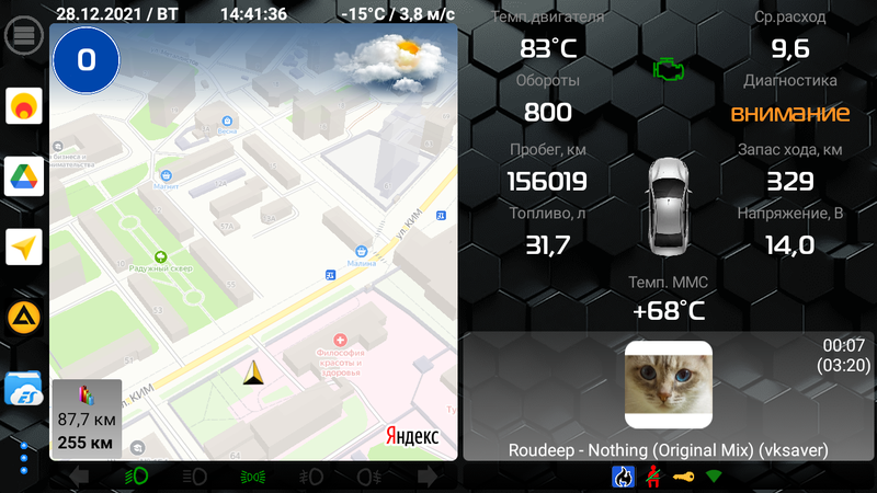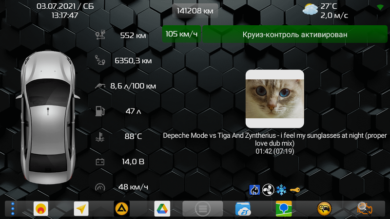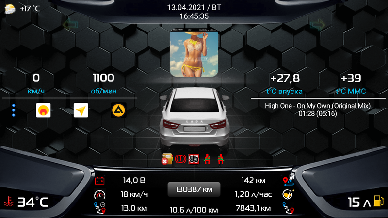 + Отображение параметров: скорости, оборотов, температуры двигателя, температуры снаружи, среднего расхода, общего пробега, напряжения в сети, количество израсходованного топлива, остаток пути на топливе, данных климатической системы (для авто с климатом), включенного ручника, низкого заряда, низкого давления масла, непристегнутого ремня пассажира и водителя, неисправности AirBag;