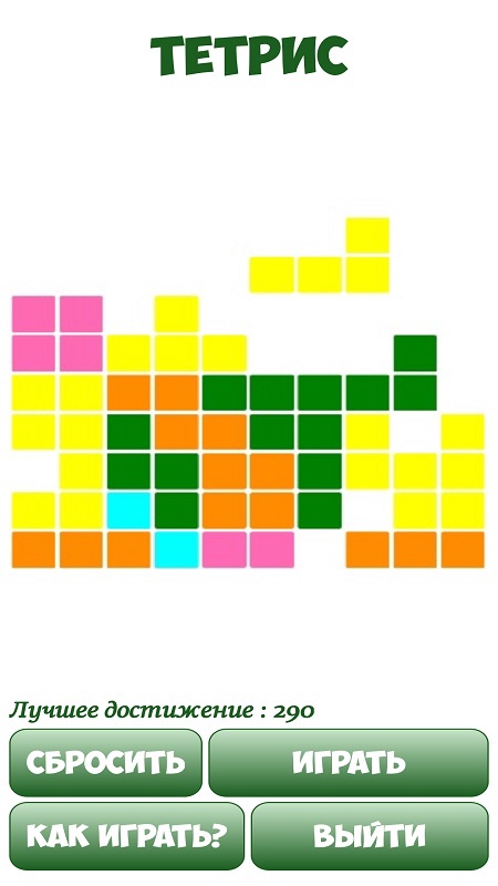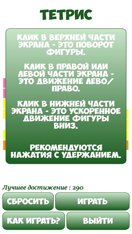 Старый добрый тетрис. Играть просто. Касание в верхней части экрана поворачивает фигурку, в правой или левой части экрана касание сдвигает фигурку в право или лево. Касание в нижней части экрана ускоряет падение фигуры. Рекомендуется использовать длительные касания.