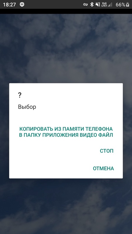 При включении приложения на экране появляется диалог для загрузки из памяти телефона небольшого видеофайла (.mp4) в память приложения.